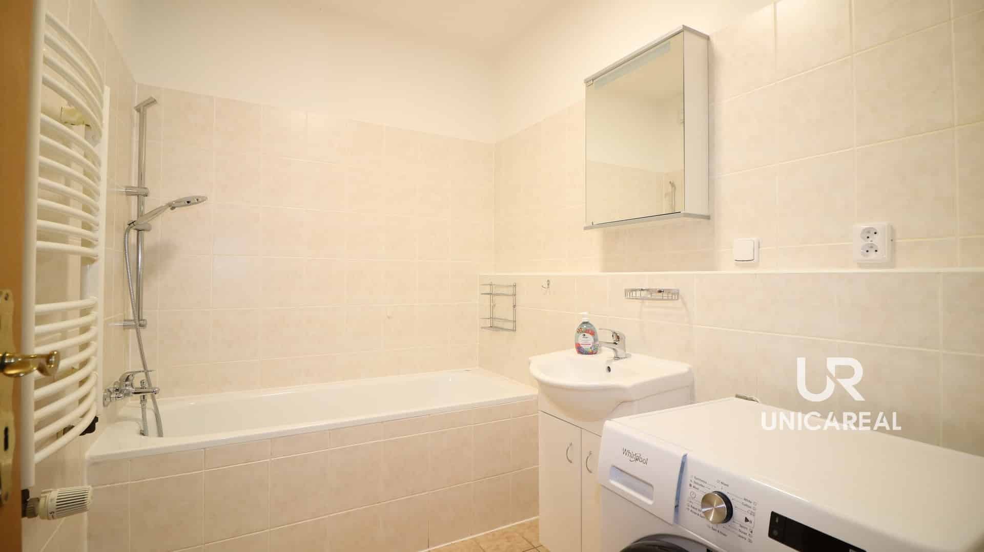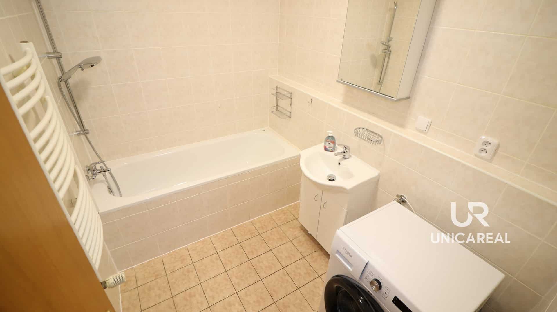 Koupelna 4,7 m2 vybavena včetně pračky, vanou a umyvadlem. Samostatná toaleta.
