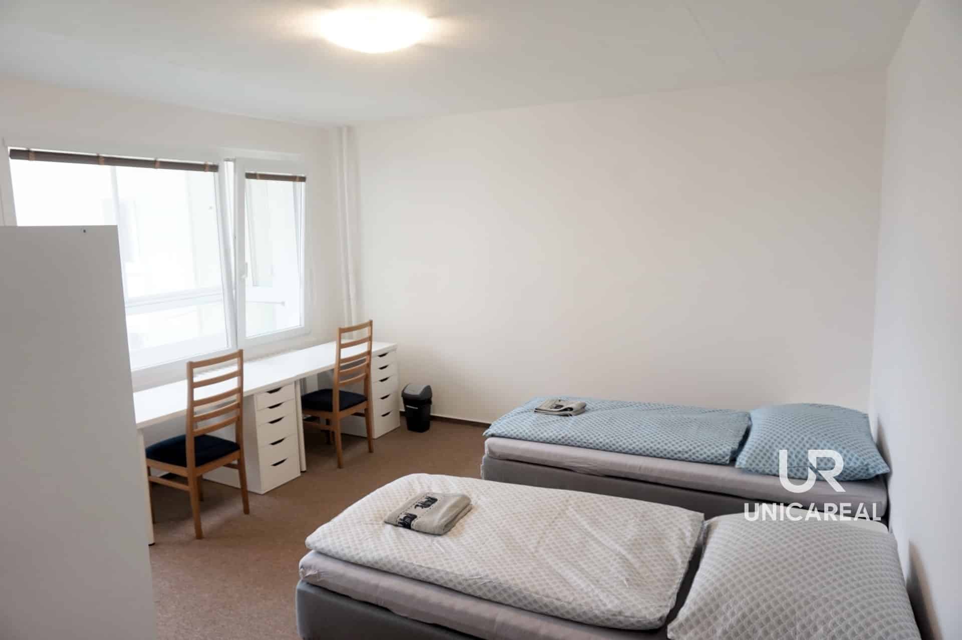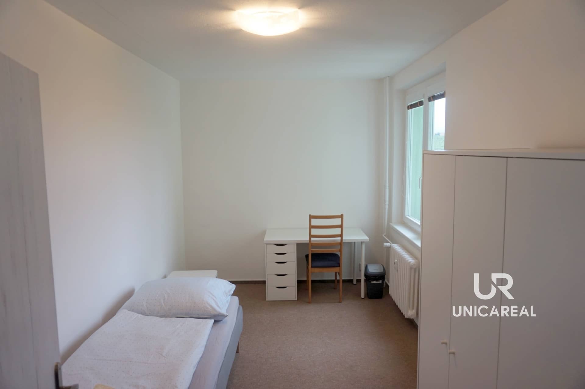 Se souhlasem majitele nabízíme k pronájmu kompletně zrekonstruovaný a dispozičně velmi dobře řešený byt 4+1 se zasklenou lodžii, nacházející se v revitalizovaném, panelovém domě, v těsné blízkosti Masarykovy univerzity, Campus Squaer a Fakultní Bohunické nemocnice, v do centra dobře dostupné lokalitě Bohunice, na ul. Spodní. Byt situovaný ve 4 n.p s 2 výtahy má celkovou užitnou plochu 80m2 + 5m2 zasklená lodžie + 2m2 sklep. Byt se samostatnými vstupy do všech místností je kompletně vybaven novým nábytkem, spotřebiči i doplňky přímo na míru 5 studentům (5 pracujícím). Kuchyňská linka je vybavena nádobím, talíři a dalším kuchyńským zařízením. Všechny místnosti jsou vybaveny jako na hotelu tzn. vč. ložního prádla a ručníků. Největší pokoj s lodžii o velikosti 19m2 je plně vybaven pro 2 osoby. Další pokoje o velikosti 12, 9 a 9m2 jsou zařízeny vždy pro 1 osobu. V případě zájmu o ubytování 6 osoby v pokoji o velikosti 12m2 lze dozařídit s navýšením nájmu o 3.000,-Kč. Přímo v místě je veškerá občanská vybavenost. Přímo u domu je k dispozici velké parkoviště. Výhodou je určitě i výborná dostupnost na dálnici. Dům má třídu energetické náročnosti C- úsporná. Měsíční, vyúčtovatelné zálohy na energie jsou ve výši 3.500,-Kč. Byt je volný ihned a prohlídky, které určitě doporučujeme jsou možné po domluvě.