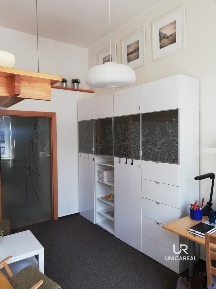 Obývací pokoj je zařízený stěnou s úložným prostorem, vyvýšeným dvoulůžkem na spaní, sedací soupravou, psacím stolem, konferenčním stolkem a dvěma křesly. Kuchyně je kompletně zařízena včetně základního nádobí. Koupelna se sprchovacím koutem včetně úložných skříněk. Vytápění vlastním plynovým kotlem, podlahové vytápění v celém bytě. Nad částí bytu je pod stropem cca 5 m2 skrytého úložného prostoru (prostor je přístupný z postele).
