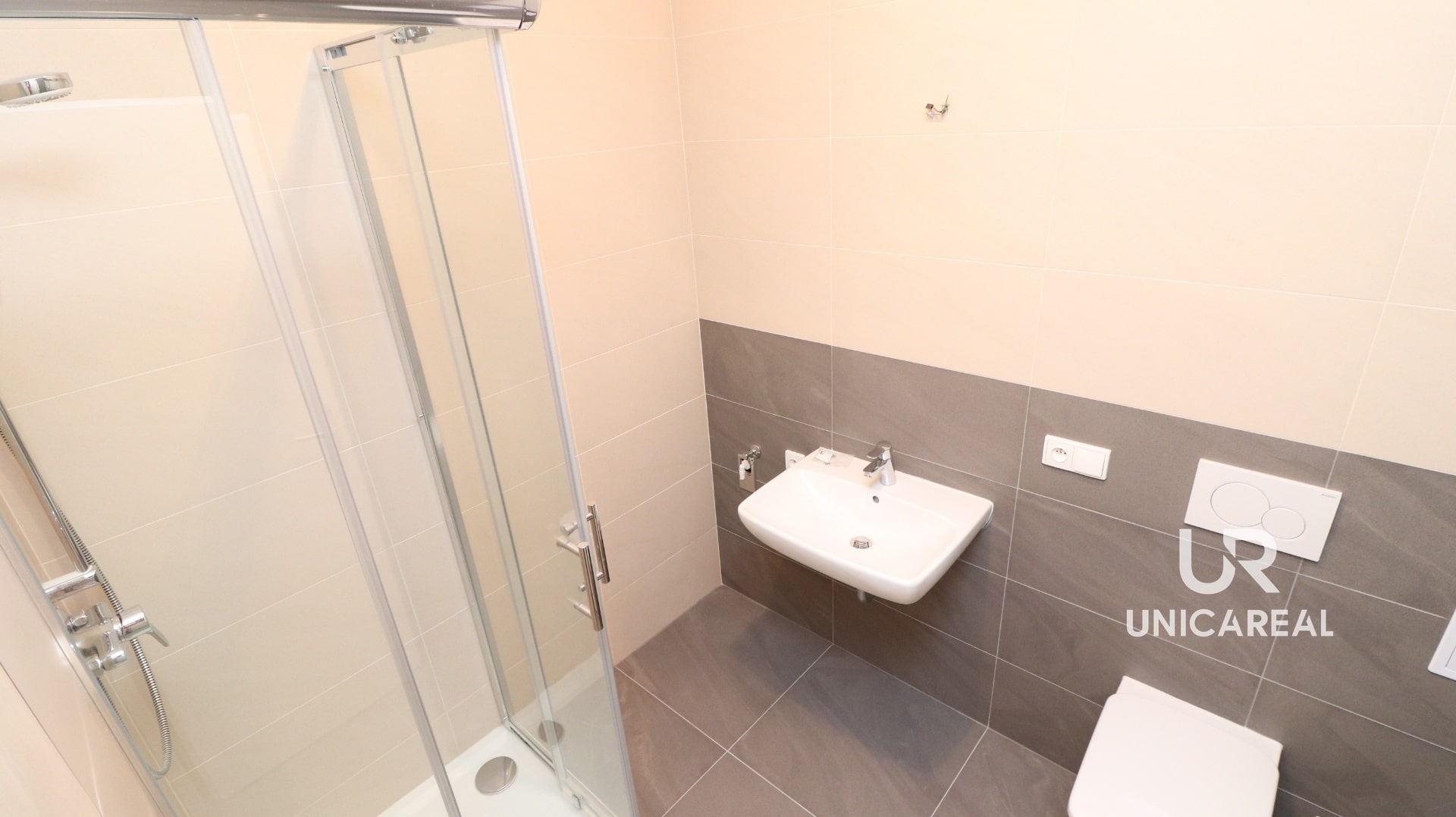 Moderní koupelna je opatřena umyvadlem, sprchovacím koutem a toaletou.