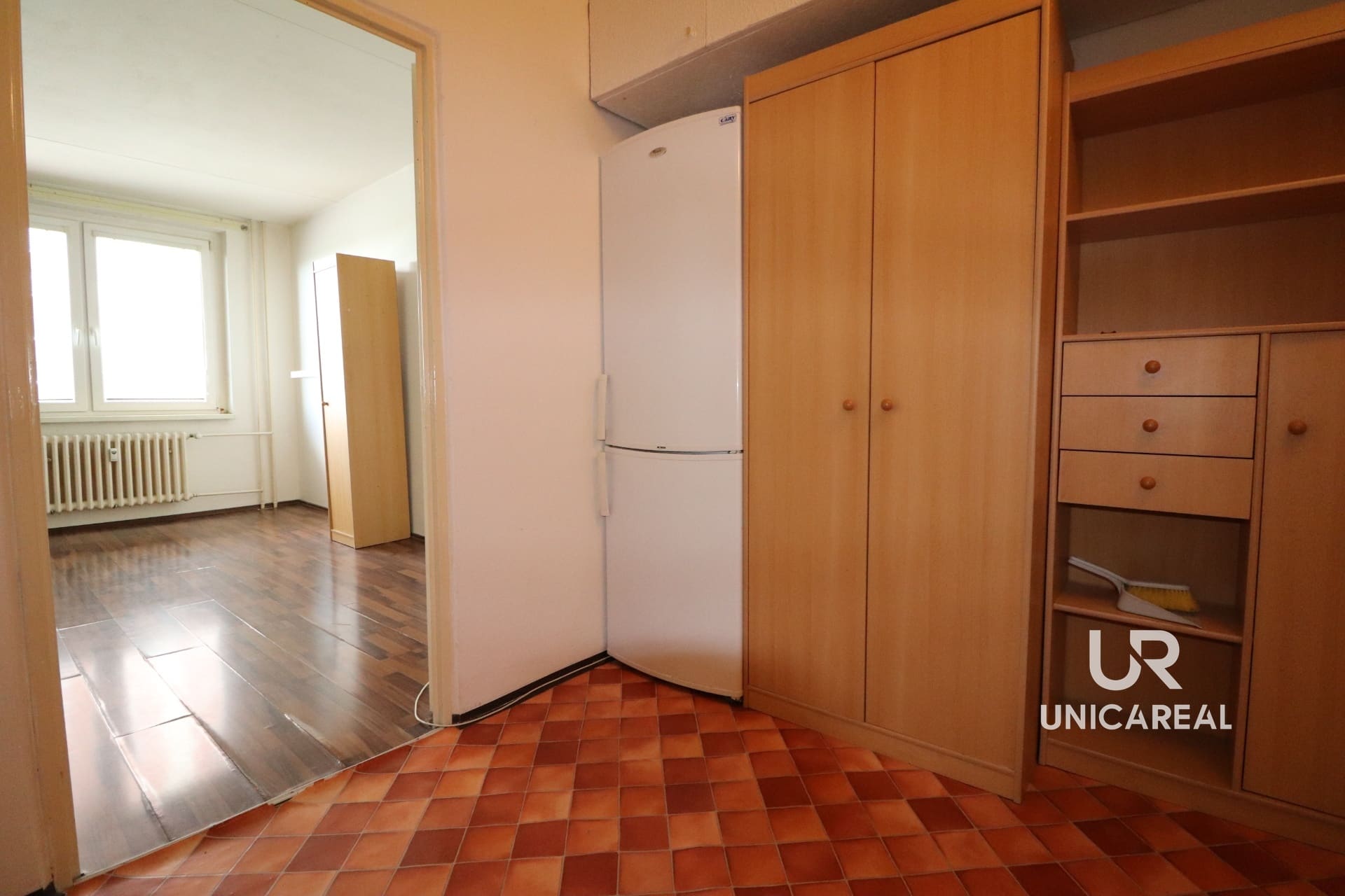 Vybavení bytu – v prostorné předsíni se nachází vestavěná šatní skříň, lednice s mrazákem, pokoj je vybaven kuchyňskou linkou s elektrickým sporákem, digestoří, varnou konvicí, mikrovlnou troubou, jídelním stolem vč. dvou jídelních židlí, úložný policový regál, menší skříň.