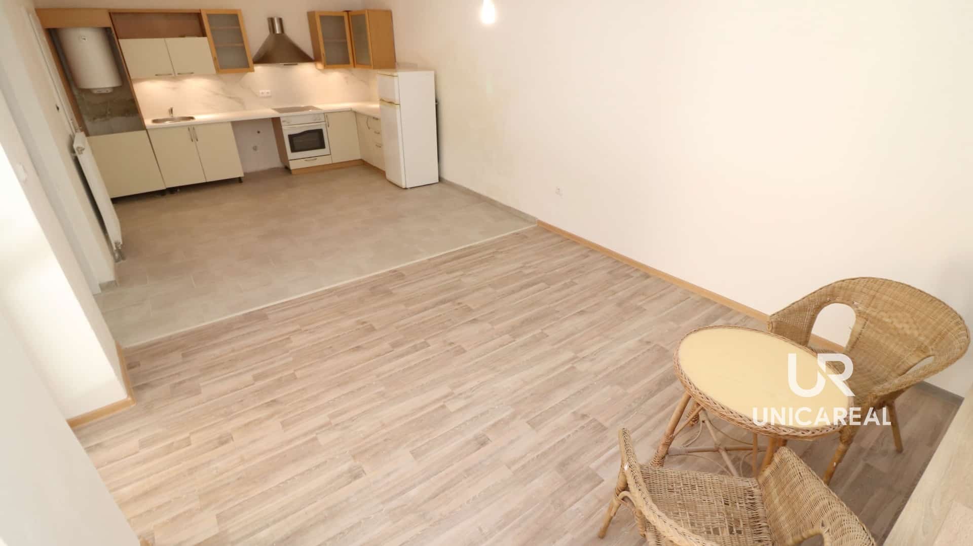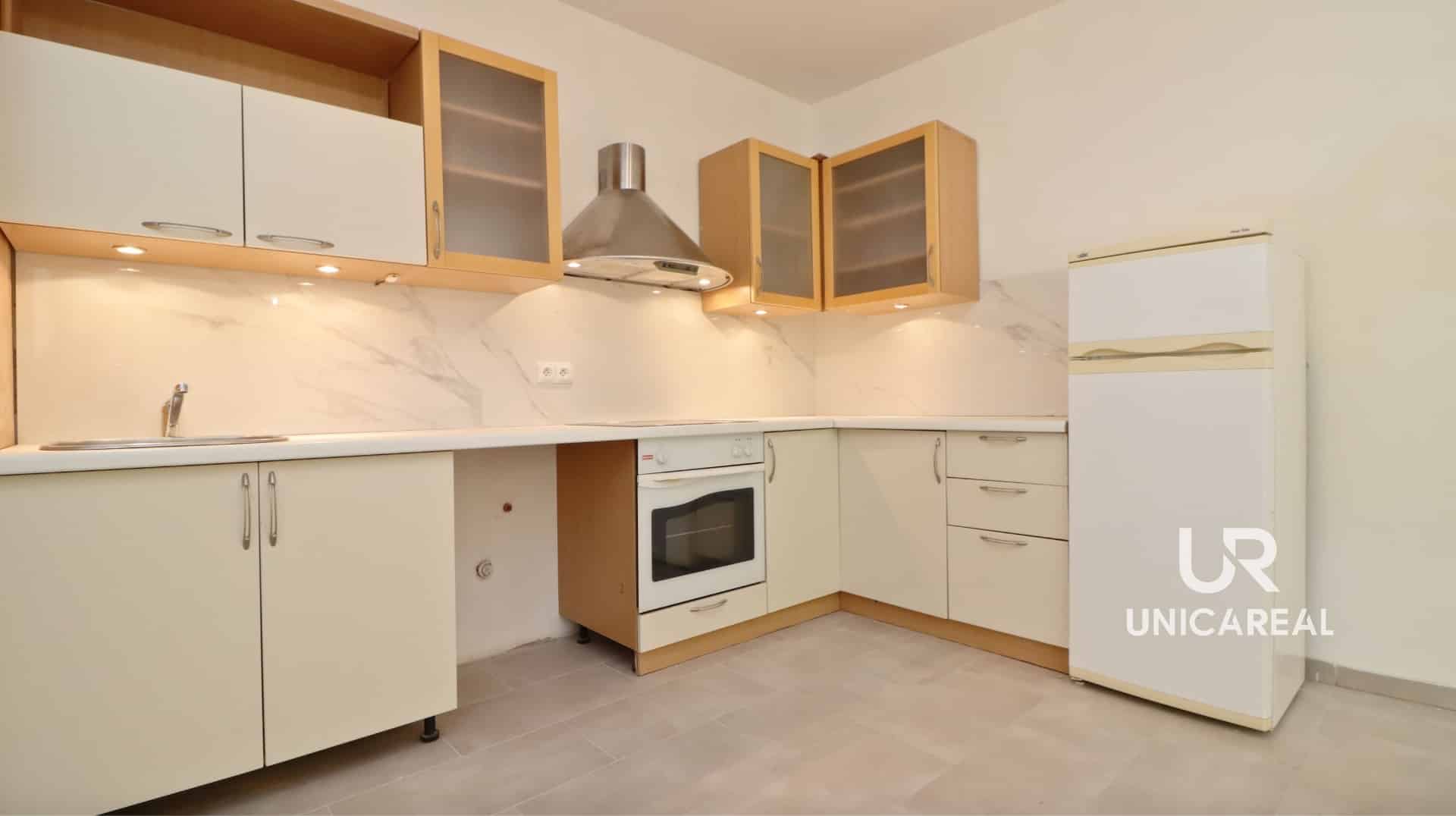 Byt se nabízí spíše nezařízený. K dispozici je pouze kuchyňská linka s varnou deskou a el. troubou, lednice, stolek a 2 ratanová křesla. V kuchyňské lince je příprava na pračku. Prostorný obývací pokoj má užitnou plochu 31m2 a ložnice 14 a 12m2. Koupelna a WC jsou samostatně. Vytápění bytu je řešeno el. kotlem a ohřev vody el. bojlerem. V případě zájmu vám zašlu půdorys bytu.