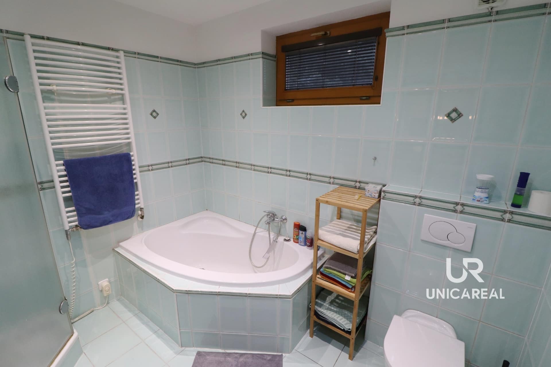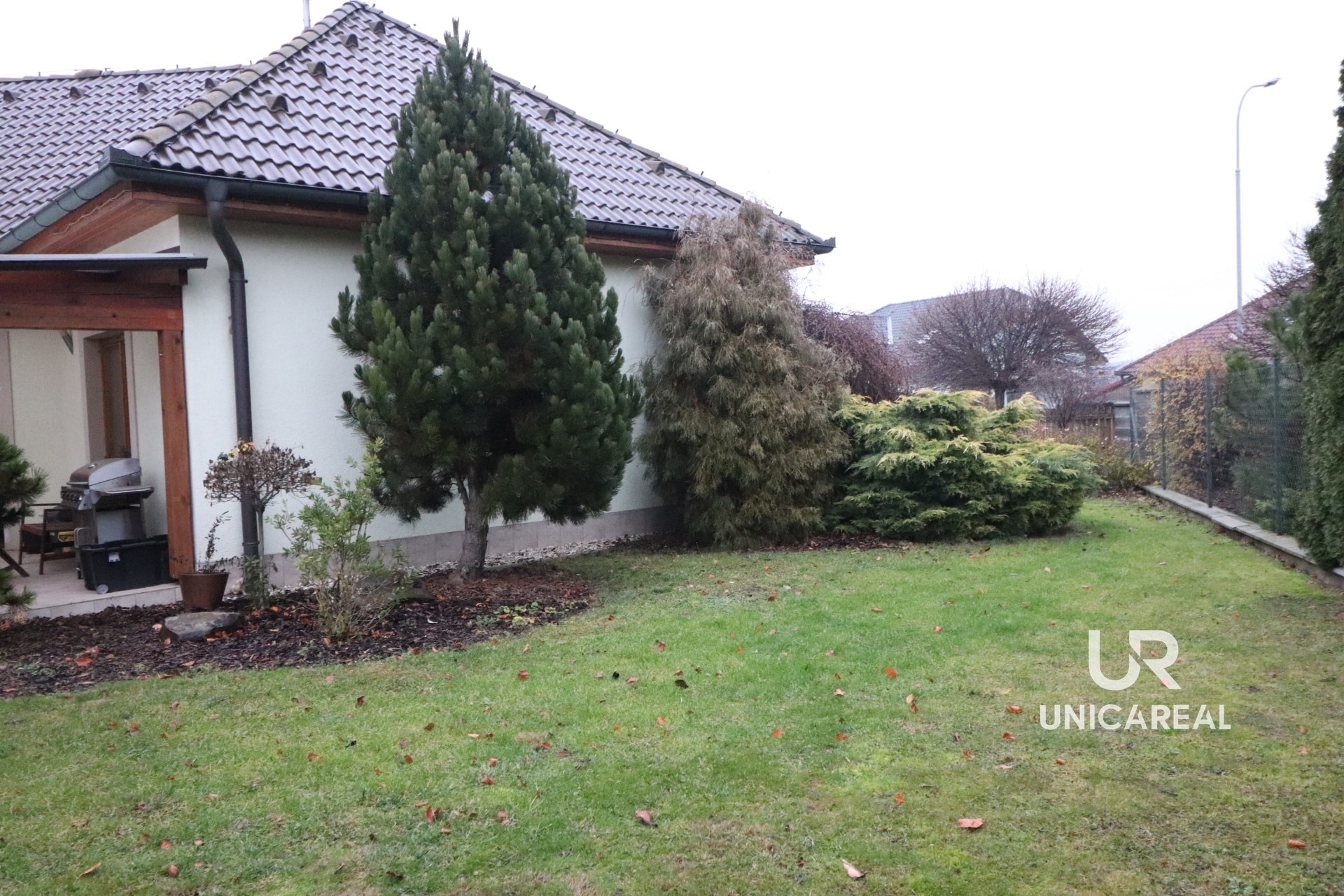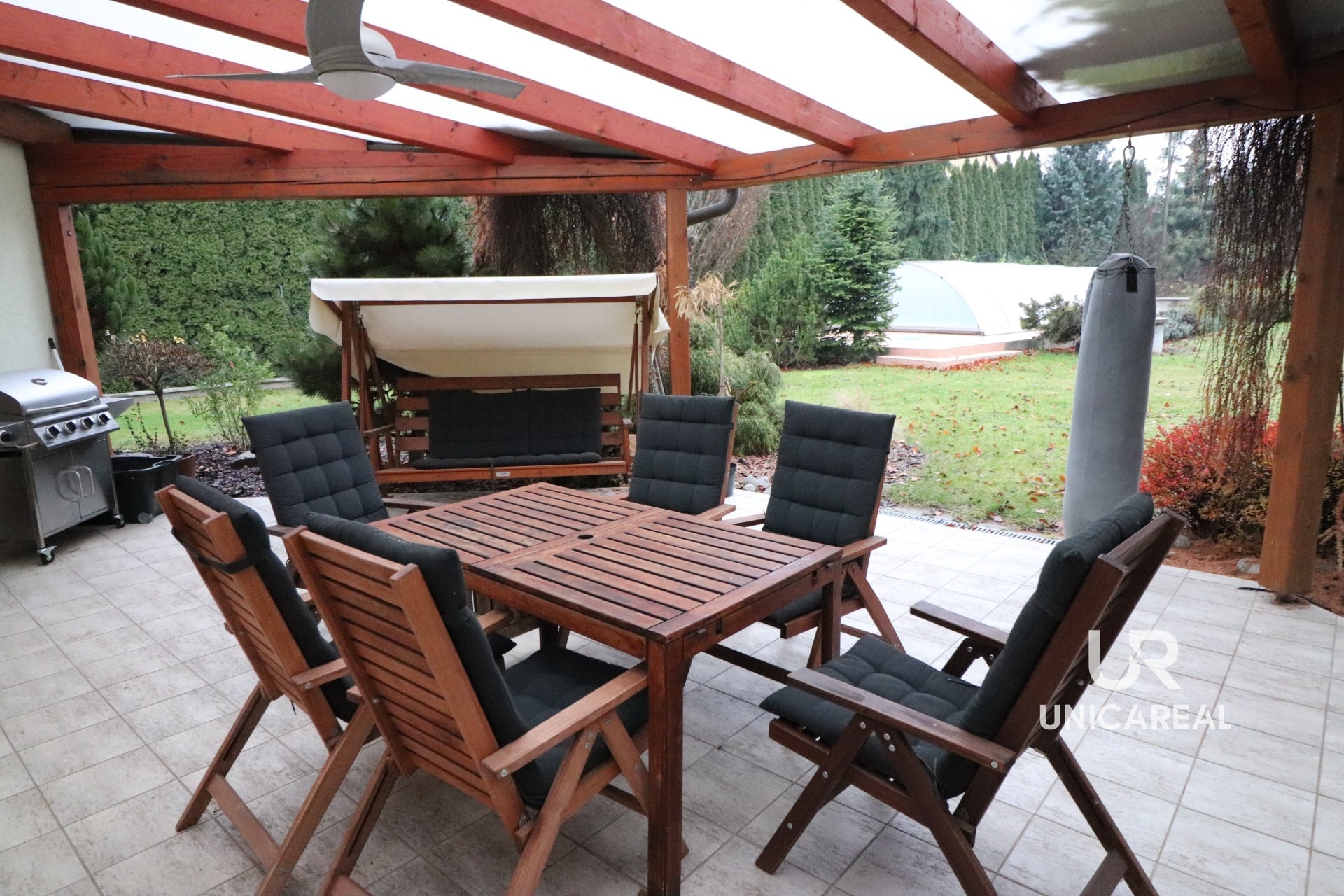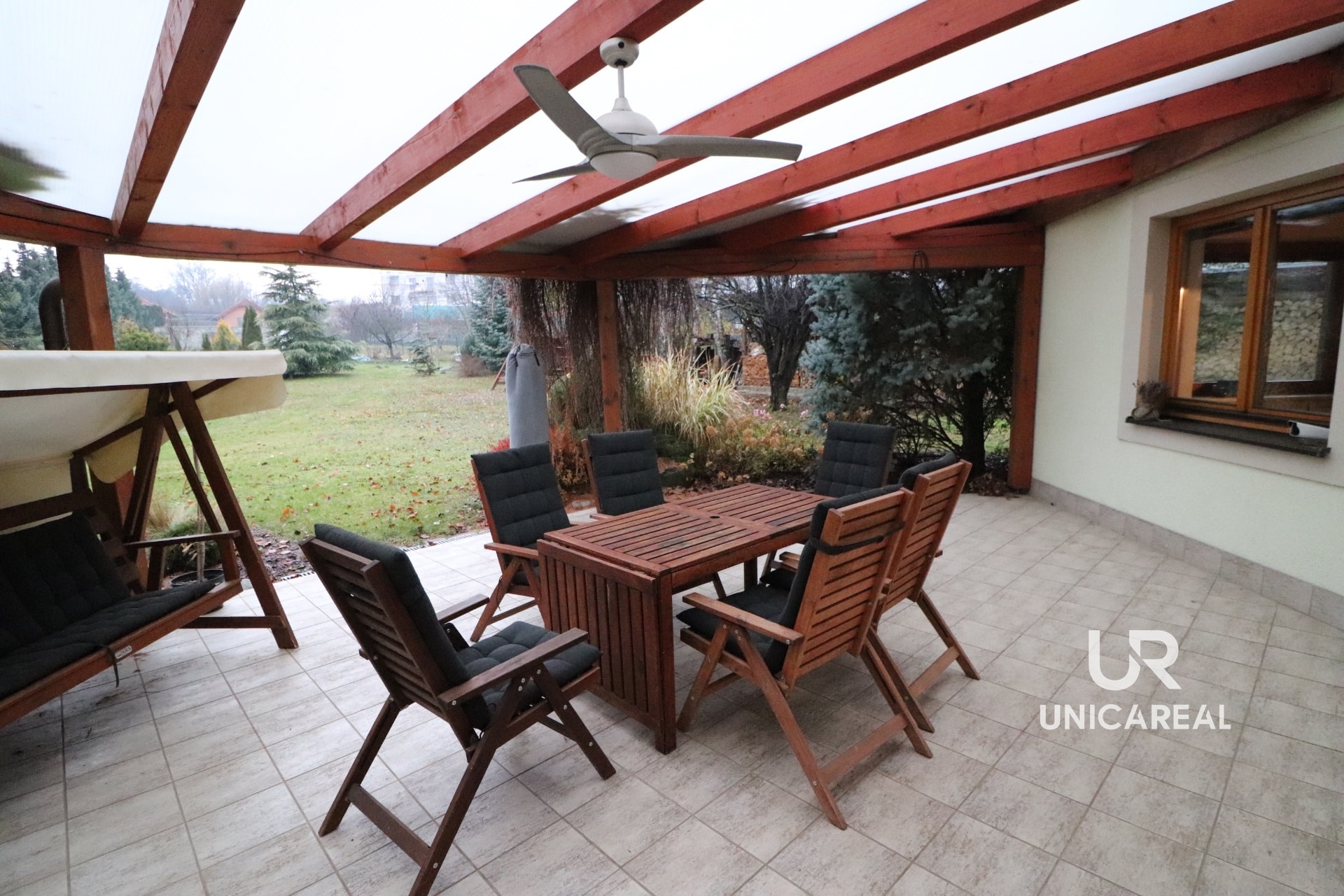 K domu náleží okrasná zahrada, venkovní zapuštěný bazén se slanou vodou a venkovní zastřešená terasa.